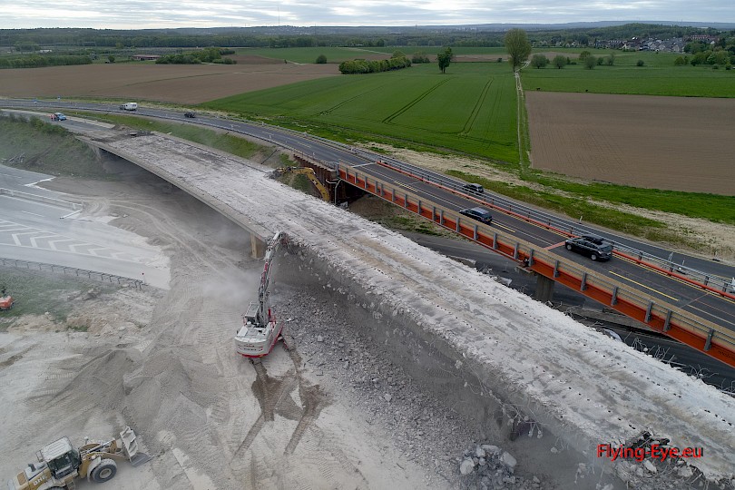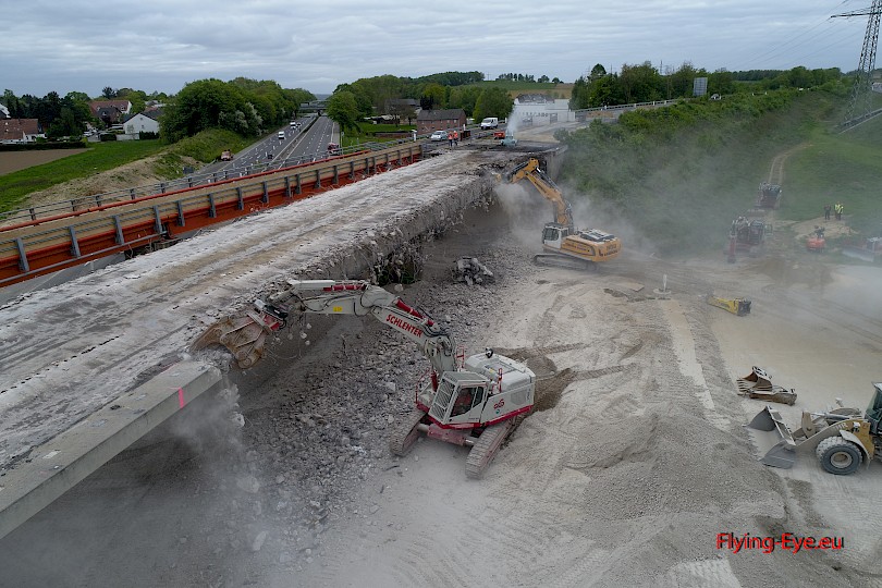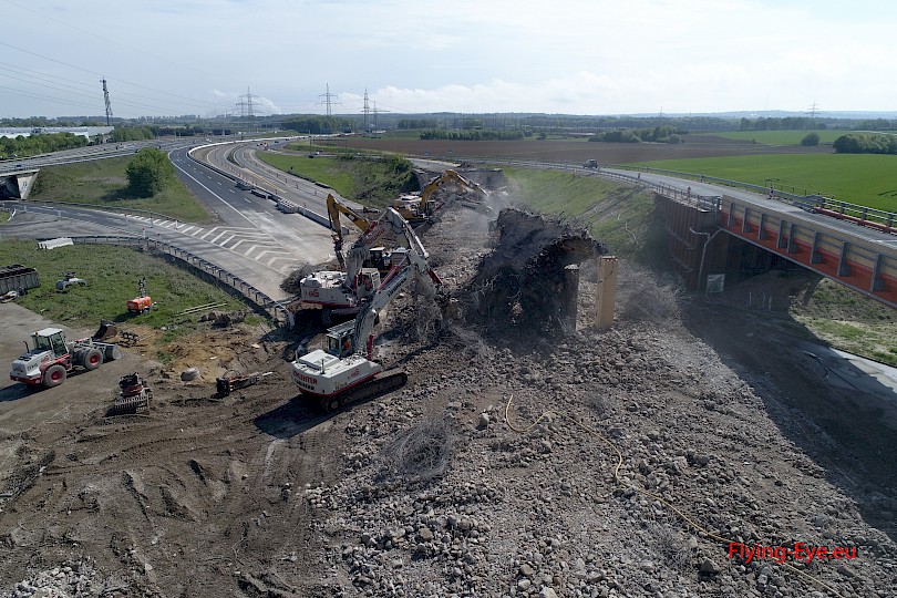 Rückbau von 2.000 m³ hochbewehrtem Spannbeton. Aufgrund der Nähe zur betriebenen Behelfsbrücke erfolgte der Abbruch unter Berücksichtigung der besonderen statischen Belange gemäß Abbruchstatik in vorbestimmter Abfolge. Zudem wurden verschiedene Stützkonstruktionen erbaut um eine Kippbewegung des Überfliegers beim Abbruch zu unterbinden.