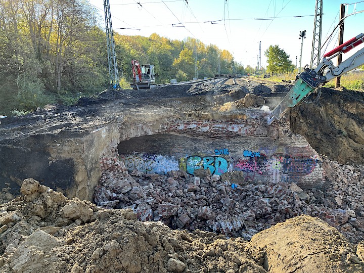Im Zuge der Erneuerung einer Eisenbahnüberführung musste zunächst das vorhandene Bauwerk, bestehend aus Ziegelmauerwerk und Beton, abschnittsweise freigelegt und abgebrochen werden. Dazu wurden zu Beginn die vier Gleise auf einer Länge von etwa 40 Metern von der Firma KAF Falkenhahn getrennt und aufgenommen. Anschließend wurde der vorhandene Gleisschotter mittels Raupe abgeschoben damit der eigentliche Rückbau beginnen konnte.