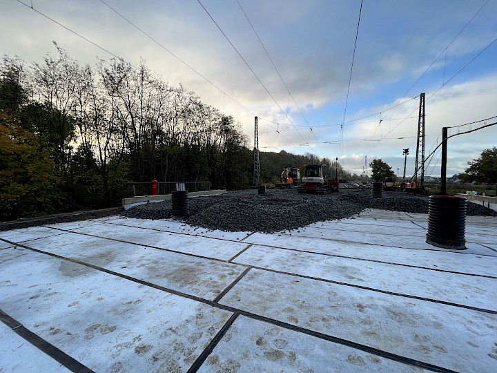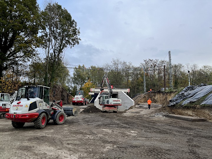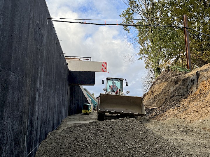 Nachdem das neue Bauwerk abgesetzt war, konnte die Baugrube lagenweise verfüllt werden. Dabei wurde im unteren Bereich Magerbeton zur Stützung des Bauwerkes eingebracht und im Zwischenbereich wurde RCL-Schottermaterial eingebaut. Die obere Lage wurde mit einer hydraulisch gebundenen Tragschicht (HGT) befestigt. Bei der Verfüllung konnte eine Tagesleitung von über 1.500 eingebauten Kubikmetern erreicht werden.
